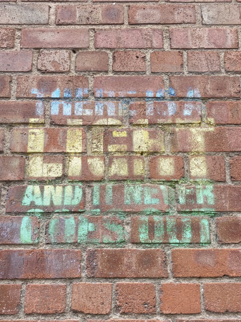 Stencilled on the brick wall in coloured writing read: “There is a light that never goes out’, the Smiths lyrics enshrined on Michael’s grave, and played at his funeral. It felt like the wall was talking to me, sending me a message. A message of hope, a message of support. Was he here? With us in this.