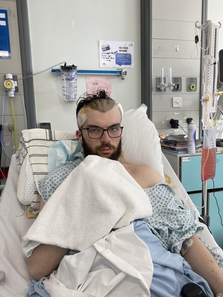 Five days after the brain tumour surgery Fred was recovering well. We were told they were going to remove the EVT drain – which meant Fred coming home was only days away. Having tubes in his neck and a bag of fluid hanging from his head was quite restricting and he wasn’t allowed to leave the ward. He was keen to get moving and had set himself the goal of visiting the in-house hospital Costa once he was free of his new ‘attachments’. He had the tubes in his neck removed earlier that day and we were waiting for a doctor to arrive to remove the drain, as nurses couldn’t carry out this procedure.